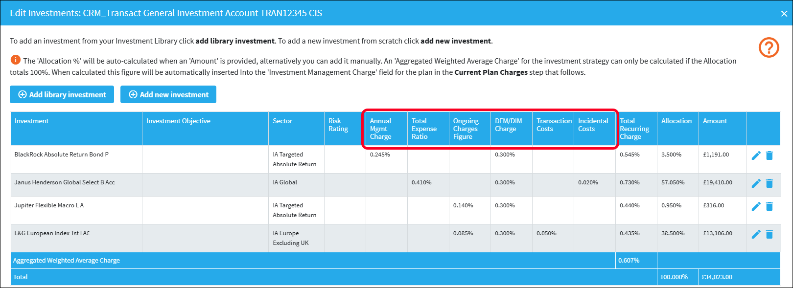 It is anticipated that these four categories will accommodate all plan charges. You should include the combined total of all investment-related charges in the 'Investment Management' field. This could include, amongst others, the AMC / TER / OCF, as well as any additional transaction or DFM / DIM charges. If you want to provide a granular break down of the investment-related charges that make up the 'Investment Management' charge, this can be achieved within the plan's investment strategy.
