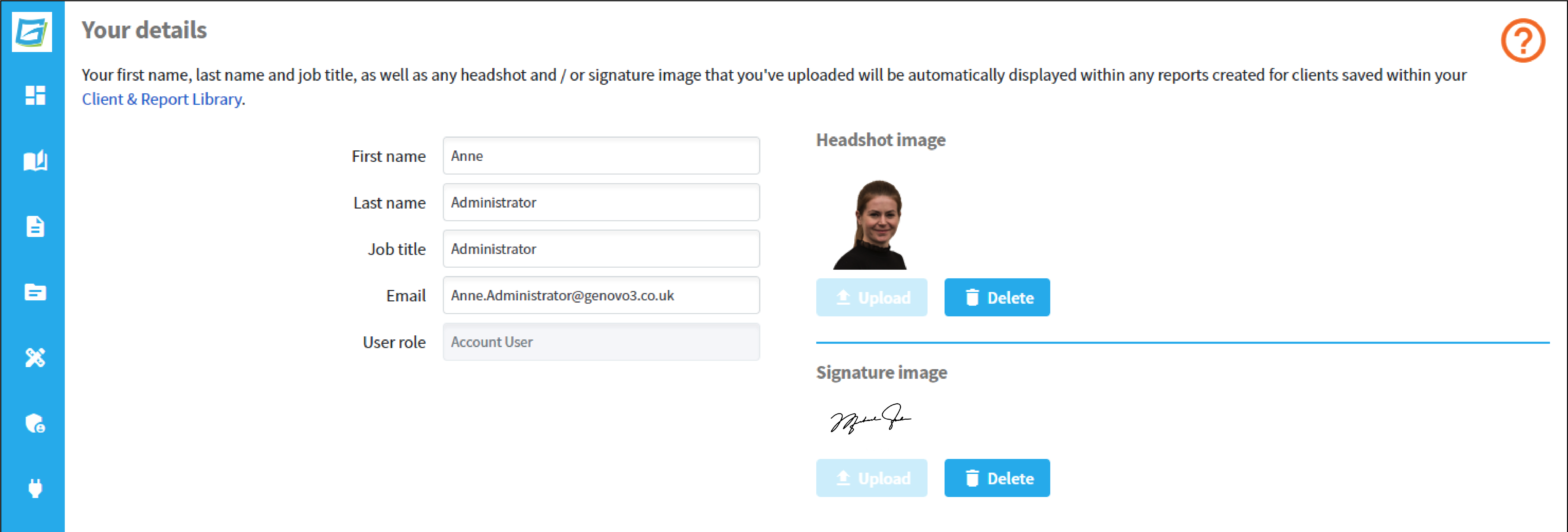 Once uploaded, the headshot and signature images of a user will be automatically inserted into any reports created for clients that are saved in that user's Client Library, irrespective of whether the report had been created by them or another user.