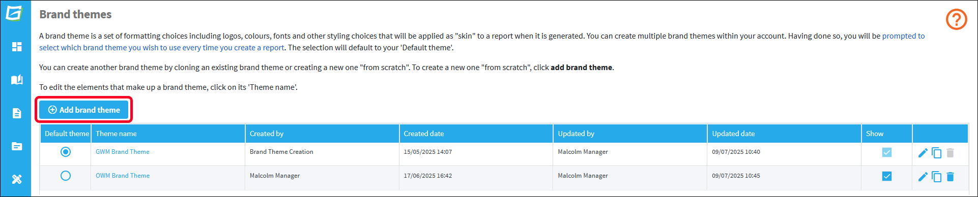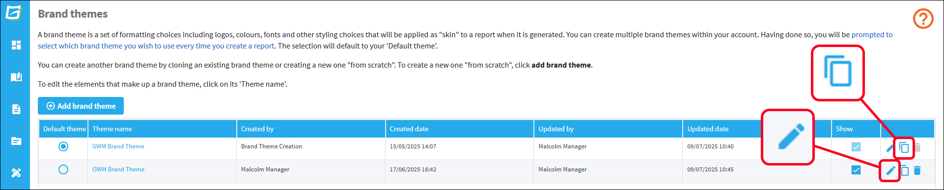 To create an exact copy of an existing brand theme that you can then edit as required, click on the clone icon.
