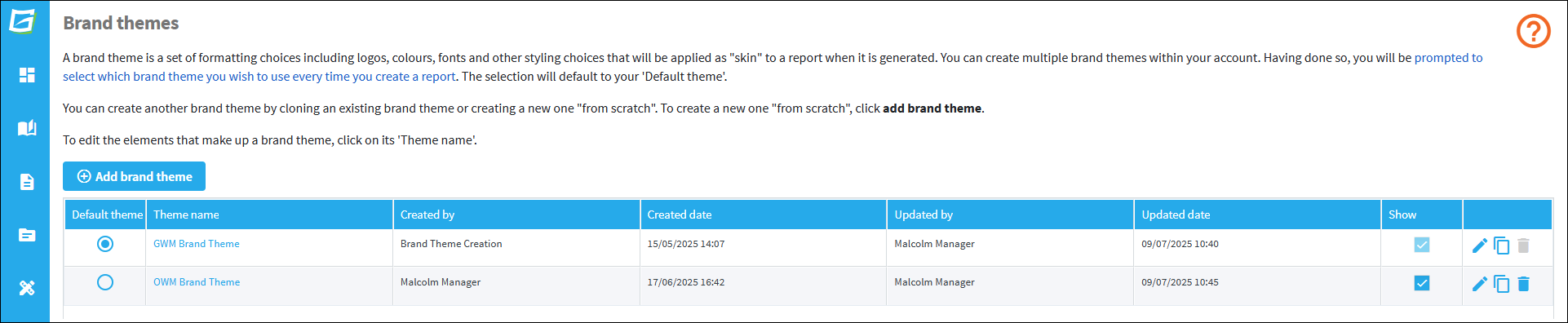 - Clone an existing brand theme. This will create an exact copy of the existing brand theme which you can then edit as required.