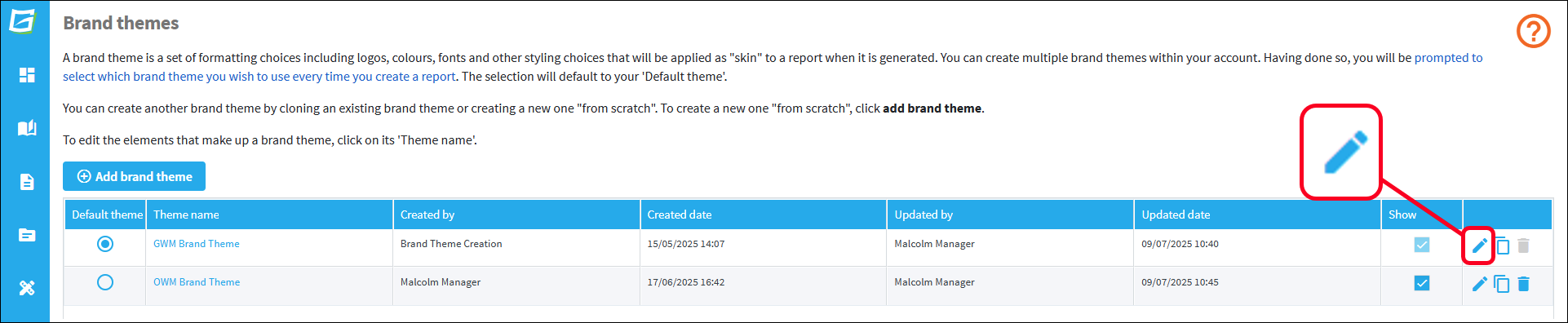 To edit the 'theme name' of a brand theme, click on the edit icon.