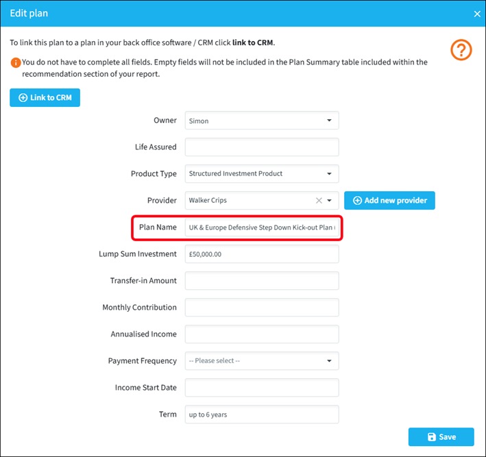 You now need to add the new structured investment product. If the new plan is already in your back office system, click the Add plans from CRM button, otherwise add the plan manually by clicking Add plan.