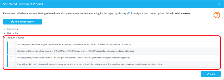 There are some structured product specific advice options in the Product features category that you can select from (or of course, you can add your own):