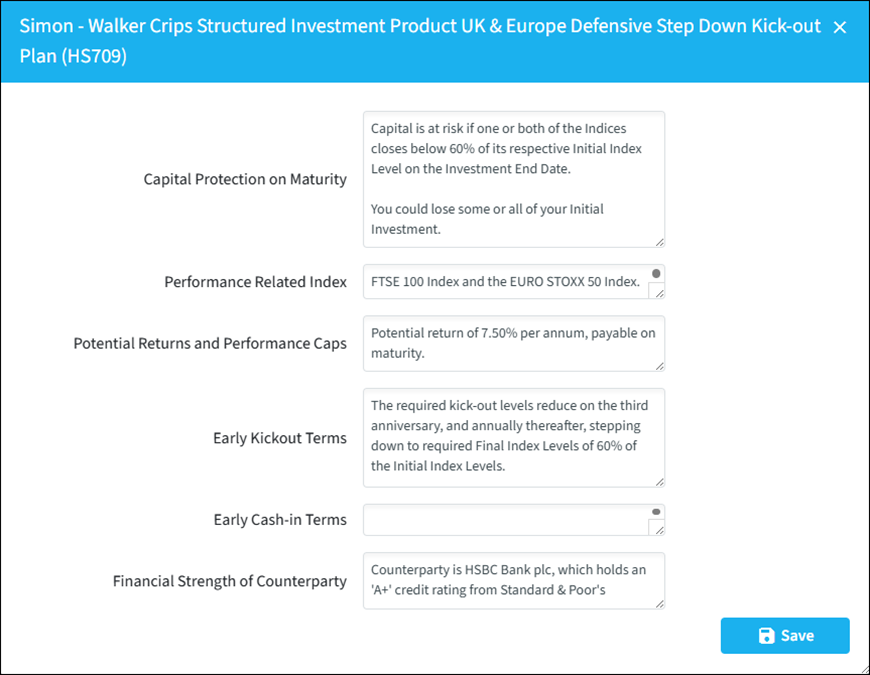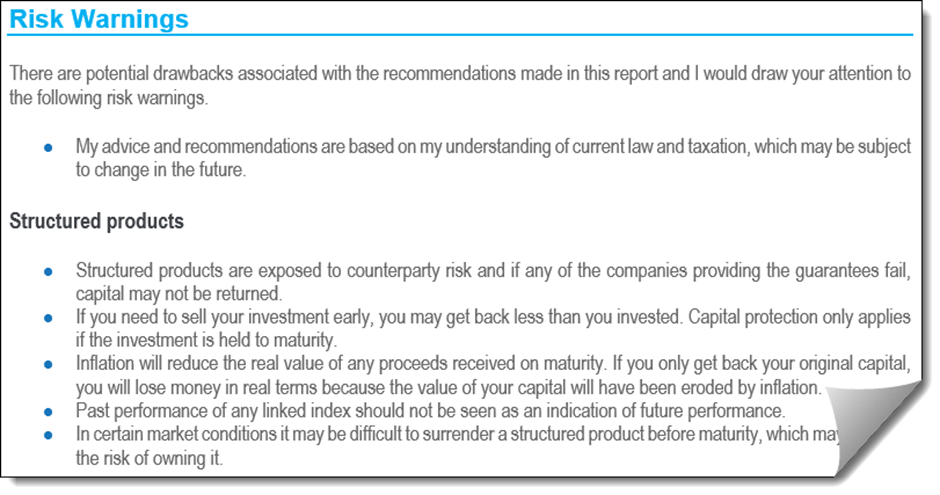Remember that in Genovo, disadvantages (will happen) are different to risks (could happen). Risk warnings suitable for structured products will be automatically included in your report, so you only need to focus on any disadvantages.